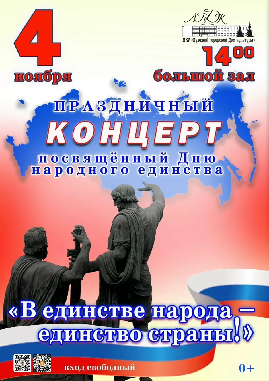 4 ноября в Большом зале Лужского городского Дома культуры состоится праздничный концерт, посвященный Дню народного единства. Начало в 14:00. Вход свободный.