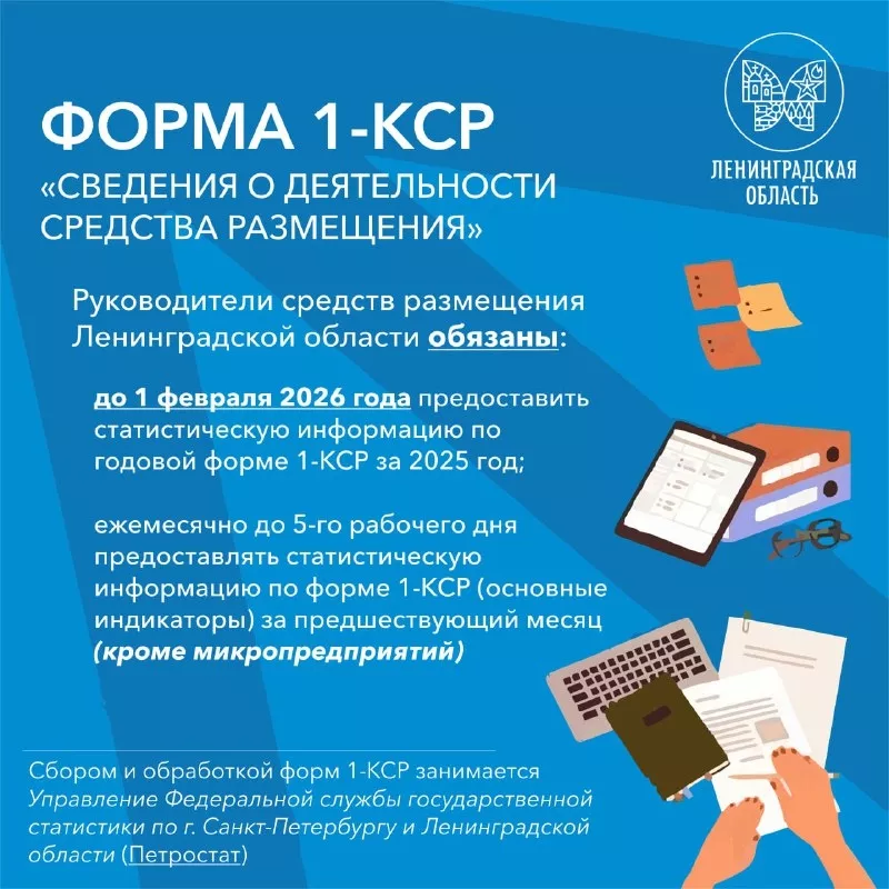 Все коллективные средства размещения (гостиницы, мотели, базы отдыха, кемпинги, глэмпинги, санатории и другие аналогичные объекты), работающие на территории Ленинградской области, обязаны предоставить годовой отчет по форме 1-КСР «Сведения о деятельности коллективного средства размещения» за 2025 год.