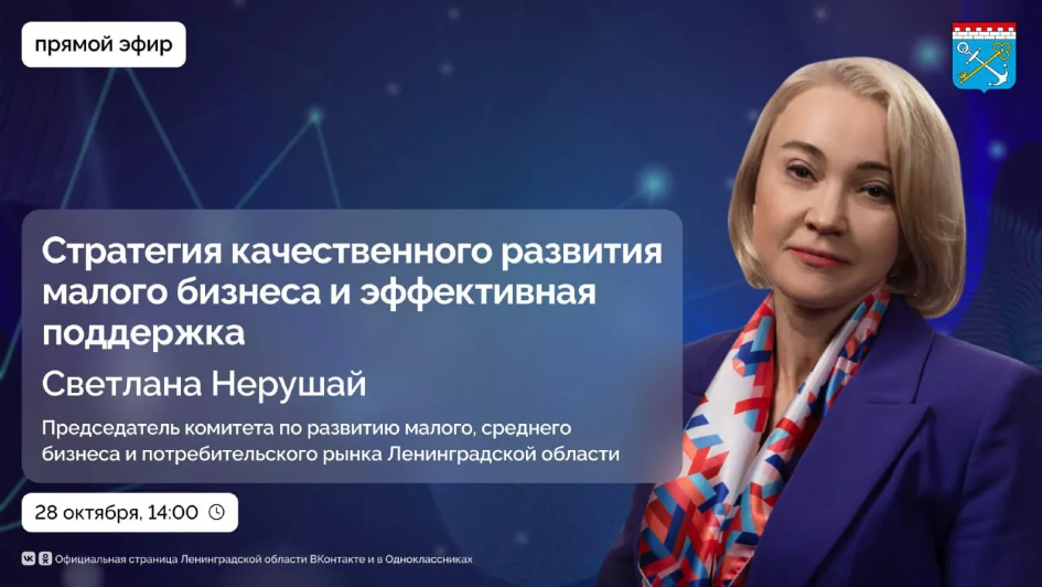 На эти и другие вопросы в ходе прямого эфира ответит председатель комитета по развитию малого, среднего бизнеса и потребительского рынка Ленинградской области Светлана Нерушай.