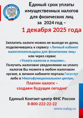 ЕДИНЫЙ СРОК УПЛАТЫ ИМУЩЕСТВЕННЫХ НАЛОГОВ ДЛЯ ФИЗИЧЕСКИХ ЛИЦ ЗА 2024 ГОД